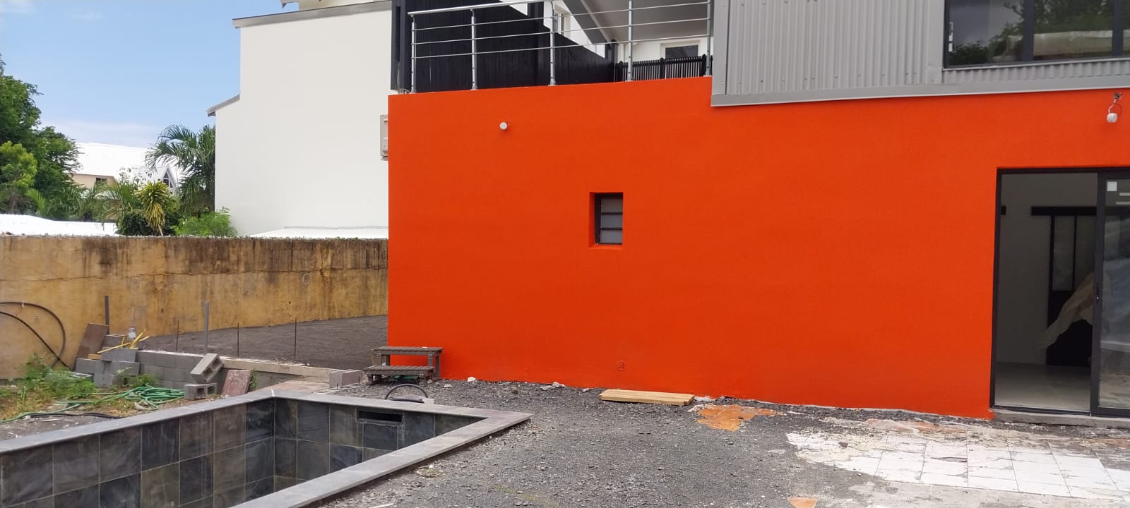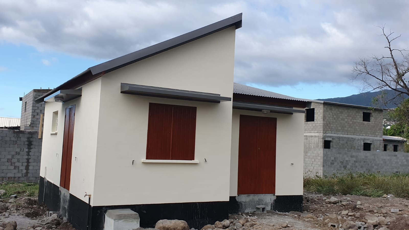 Conception et réalisation d’un abri moderne en milieu tropical, pensé pour offrir fonctionnalité, durabilité et intégration paysagère. Structure compacte avec bardage horizontal, toiture inclinée pour évacuation optimale des eaux de pluie, et ventilation naturelle par persiennes métalliques. Le bâtiment est accessible par une allée bétonnée et s’insère harmonieusement dans un environnement végétal dense. Ce projet illustre la capacité de MM INGEBAT à adapter ses constructions aux contraintes climatiques et aux usages spécifiques.